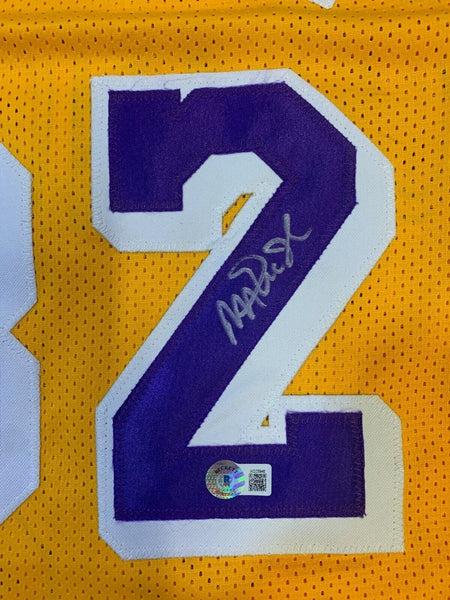 Magic Johnson has autographed this pro style gold custom jersey size XL name and numbers sewn on. Jersey is not associated with any team or league. Autograph is authenticated by Beckett Authentication Services (BAS) who was present for the signing with him and witnessed him signing your item.
