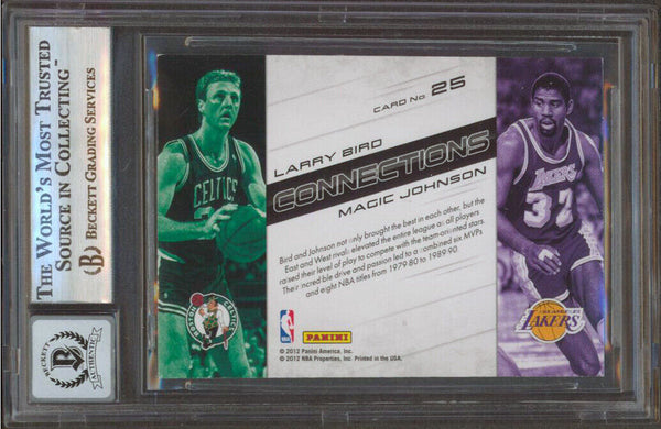 This Autographed Auto Graded Gem Mint 10! 2012 Prestige Connections #25 Card has been Personally Signed by Magic Johnson & Larry Bird. This item is 100% Authentic, it comes slabbed and authenticated by Beckett Authentication Services. This is a stock item. We conducted an autograph signing with Magic Johnson & Larry Bird and we have several of these available. The one you will receive will be of equal quality to the one pictured. This item can be verified through BAS Slabbed.