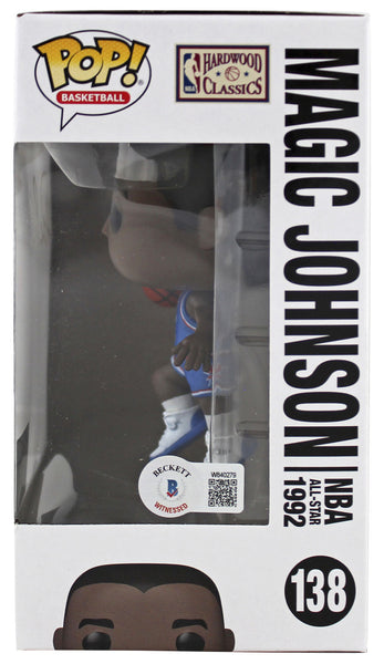 This Autographed w/ White Signature 1992 NBA All-Star Game #138 Funko Pop Vinyl Figure has been Personally Signed by Magic Johnson of the Los Angeles Lakers. This item is 100% Authentic to include a hologram by Beckett Authentication Services. This item will come with an affixed Beckett Authentication Services (BAS) authentication sticker, which includes a scannable QR code to verify authenticity. Please note that Beckett no longer provides serial-numbered COA cards, and the attached BAS sticker will serve as the complete authentication for this item. This is a BAS Witnessed Protection Program item which means a Beckett Authentication Service representative was present when this item was being signed. We conducted an autograph signing with Magic Johnson where multiples of the same item were signed. While the photographs are representative of this item, the size, placement and strength of the signature may vary. Each item is hand signed, therefore, each autograph is unique. This item can be verified through BAS Witnessed. The boxes may have some wear as the dolls were removed to ship the boxes for the signing, and are in good condition but may not be considered mint. They will ship in a Pop protector.