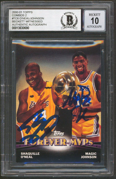 This Autographed Auto Graded Gem Mint 10! 2000 Topps Combos 2 #TC6 Card has been Personally Signed by Shaquille O'Neal & Magic Johnson. This item is 100% Authentic, it comes slabbed and authenticated by Beckett Authentication Services. We conducted an autograph signing with Shaquille O'Neal & Magic Johnson where multiples of the same item were signed. While the photographs are representative of this item, the size, placement and strength of the signature may vary. Each item is hand signed, therefore, each autograph is unique. This item can be verified through BAS Slabbed.