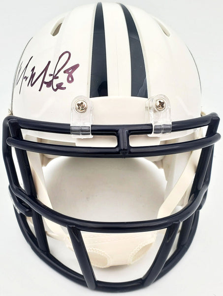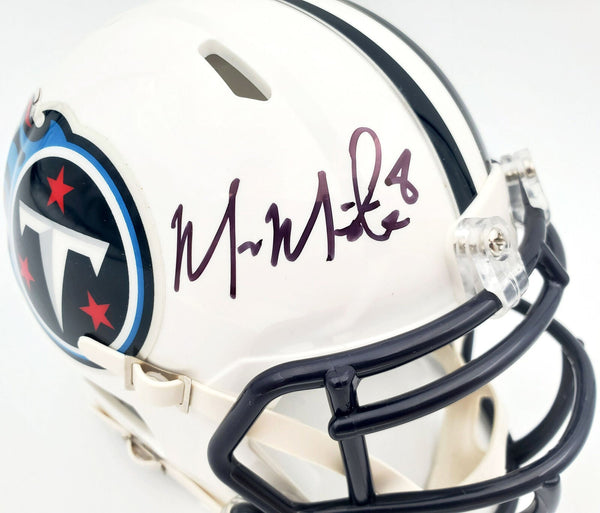 This is a Tennessee Titans Speed Mini Helmet that has been hand signed by Marcus Mariota. This item has been certified authentic by Beckett Authentication (BAS) and comes with their sticker and matching certificate of authenticity.