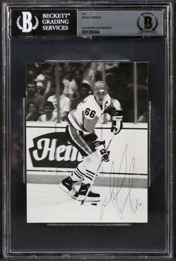 This Autographed 4.25x5.5 Cut Signature has been Personally Signed by Mario Lemieux of the Pittsburgh Peguins. This item is 100% Authentic, it comes slabbed and authenticated by Beckett Authentication Services. The authenticity can be verified on Beckett Authentication Services website.