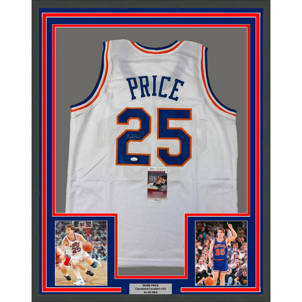 Framed Autographed/Signed Mark Price 33x42 Cleveland White Jersey JSA COA The item is professionally framed and matted with two 5x7 photos, measures 35 inches by 39 inches and is ready to be hung in your man cave! Photo and matting requests can be made.