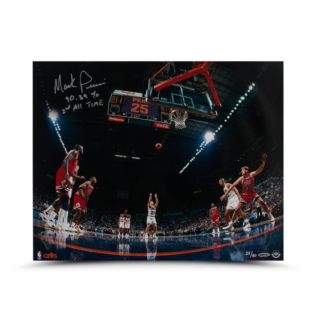 When he began his NBA career in 1986 following an All-America stint at Georgia Tech, Mark Price didn't necessarily set out to become the league's top free throw shooter. He had been a consistent shooter in college but getting into the 90 percent range with the high pressure of the NBA and its tough road environments was a challenge on another level. He shot a more than respectable 83.3 percent his rookie season, but that would end up being the lowest mark of his 12-year career. He shot higher than 90 percent seven times in his career, including a career-best 94.8 mark in 1992-93 (he shot 100 percent in '95-96 but that was in only 10 attempts). That '92-93 effort came a year after shooting 94.7 from the charity stripe. He finished his career with a 90.39 mark, which still remains second behind Steve Nash on the NBA's all-time list. He has inscribed that mark on this photo from a home game against Chicago. In this image, Price is shooting a free throw against the Bulls at Gund Arena in 1994. Price has signed and inscribed "90.39% 2nd All Time" on this limited edition (50) Free Throw 16" x 20" image in silver paint pen. His signature is deemed authentic by virtue of Upper Deck Authenticated's Five Step Process.