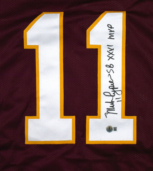 THIS IS NOT AN NFL JERSEY. THIS HAS NO TAGS, NO LOGOS, NO EMBLEMS. This is a hand autograph of Mark Rypien on a Custom Made (non name brand) Authentic Style Jersey with stitched letters and numbers. Inscribed SB MVP. This item has a Beckett Witnessed Authentication, which comes with a Beckett numbered sticker hologram and a QR Code for verification. You can view this item on the Beckett Authentication website and it shows when and where the item was signed. It was signed either at a public autograph appearance or a private signing. This is a stock photo of the item. Although you may not receive this exact item, the item you receive is virtually identical and brand new in great shape. Jersey size is XL. THIS IS NOT AN NFL JERSEY. THIS HAS NO TAGS, NO LOGOS, NO EMBLEMS. This is a hand autograph of Mark Rypien on a Custom Made (non name brand) Authentic Style Jersey with stitched letters and numbers. Inscribed SB MVP. This item has a Beckett Witnessed Authentication, which comes with a Beckett numbered sticker hologram and a QR Code for verification. You can view this item on the Beckett Authentication website and it shows when and where the item was signed. It was signed either at a public autograph appearance or a private signing. This is a stock photo of the item. Although you may not receive this exact item, the item you receive is virtually identical and brand new in great shape. Jersey size is XL.