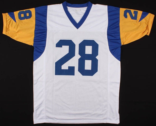 Custom on-field style jersey. Everything is sewn on, size XL. Hand-signed in black felt-tip pen by Marshall Faulk (Rams, Colts, HOF). The lot / autograph(s) includes an official Beckett Authentication Services serially numbered hologram for authenticity purposes. The signing of this item was witnessed by Beckett.Authentication: Beckett Hologram
