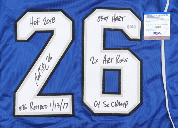 Martin St. Louis Signed Jersey Inscribed HOF 2018, Retired 1/13/17, 03/04 HART, 2x Art Ross & 04 SC Champ (PSA COA)Custom on-ice style Tampa Bay Lightning Bolts Captain's jersey with everything sewn on, size adult XL. Hand-signed and 5x inscribed by Martin St. Louis (HOF).The autograph includes an official PSA/DNA hologram and matching COA for authenticity purposes. The signing of this item was witnessed by PSA.Authentication: PSA COA