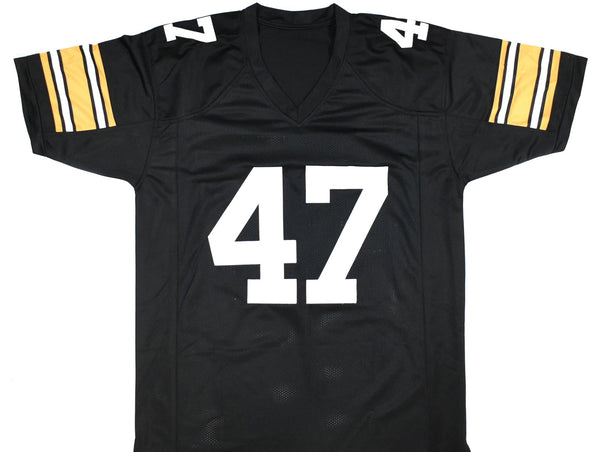 THIS IS NOT AN NFL JERSEY. THIS HAS NO TAGS, NO LOGOS, NO EMBLEMS. This is a hand autograph of Mel Blount of the Pittsburgh Steelers on a Custom made (non-name brand) Authentic Style Jersey with stitched letters and numbers. This item has a Prova Authentication, which comes with a Prova numbered sticker hologram. You can view this item on the Prova Authentication website. It was signed either at a public autograph appearance or a private signing. This is a stock photo of the item. Although you may not receive this exact item, the item you receive is virtually identical and brand new in great shape. Jersey size is XL. THIS IS NOT AN NFL JERSEY. THIS HAS NO TAGS, NO LOGOS, NO EMBLEMS. This is a hand autograph of Mel Blount of the Pittsburgh Steelers on a Custom made (non-name brand) Authentic Style Jersey with stitched letters and numbers. This item has a Prova Authentication, which comes with a Prova numbered sticker hologram. You can view this item on the Prova Authentication website. It was signed either at a public autograph appearance or a private signing. This is a stock photo of the item. Although you may not receive this exact item, the item you receive is virtually identical and brand new in great shape. Jersey size is XL.
