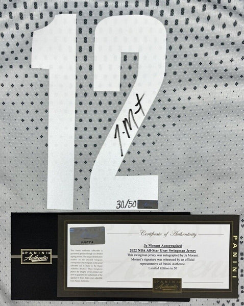 Is a sold out 2022 Memphis Grizzlies NBA All Star Gray jersey autographed by Ja Morant. This jersey is limited to just 50. This autographed jersey includes a Panini Authentic certificate of authenticity with a unique hologram number that corresponds to the hologram on the actual collectible. These holograms protect the integrity of the product and serve to guarantee the authenticity of the signature it bears. MONEY BACK GUARANTEE! If for any reason you are not completely satisfied with the quality or authenticity of your purchase, we will gladly give you a full refund or exchange, whichever you prefer up to 30 days after purchase. Please feel free to e-mail us with any questions. Thank you. Authenticator Pre-Certified Authenticator: Panini Authenticated History of item: Ja Morant has signed this item in the presence of a representative from Panini Authenticated. Describe how you came to possess this item: Super Sports Center is a fully authorized dealer for Upper Deck Authenticated as well as Panini Authenticated, Mounted Memories and Steiner Sports. Other information about you and / or the item: Super Sports Center strives to deliver the most authentic in sports memorabilia from trusted companies like Mounted Memories, Steiner Sports and Upper Deck Authenticated. If it exists, we can find it for you!