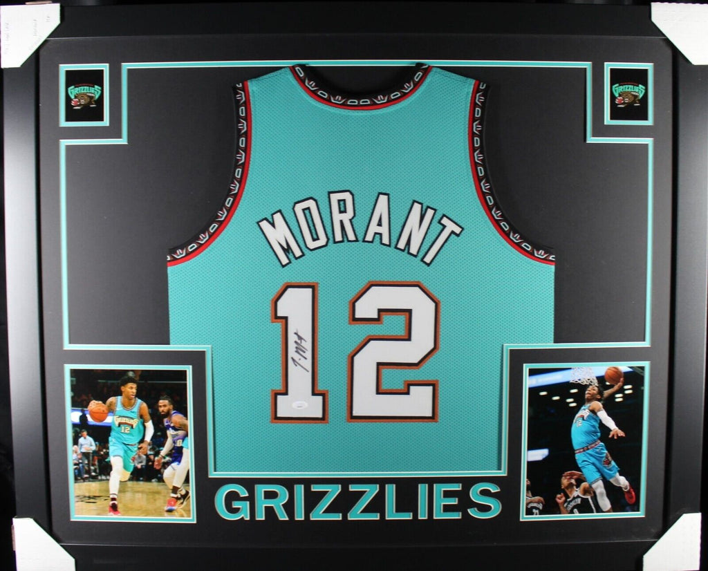 JA MORANT AUTOGRAPHED & PROFESSIONALLY FRAMED PRO-STYLE JERSEY(Occasionally our own stock pictures are used at times due to quantity of framing, all frames will look identical as the one pictured)THE FRAMED JERSEY MEASURES 35"x 44" & COMES WITH THE FOLLOWING:-UV Protected Acrylic-Triple Acid Free Team Colored Matting-2 High Quality 8"x10" Photos-Team LogoEvery framed autographed jersey is accompanied with a tamper-proof hologram on the signed part of the jersey from one of the main authenticators in the industry (JSA, Beckett, PSA, etc.) and can be verified on their corresponding websites to prove authenticity.