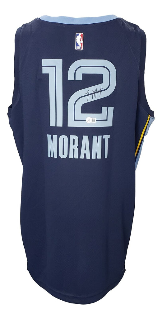 Featured is a Ja Morant signed Memphis Grizzlies navy blue Swingman jersey. This jersey has been hand signed by Morant and comes with the Beckett hologram and certificate of authenticity. This jersey features professionally sewn letters and numbers and is size XL. This jersey would make a great addition to any sports memorabilia collection!. SPECIFICATIONS Autographed By: Ja Morant Team: Memphis Grizzlies Sport: Basketball Authentication: Beckett Grading Services