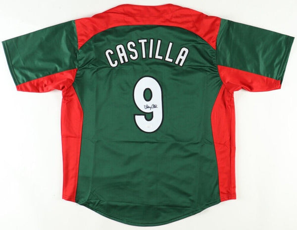 Custom on-field Team Mexico style jersey with everything sewn on, size Adult Large. Hand-signed by Vinny Castilla (Atlanta Braves, Colorado Rockies, Tampa Bay Rays).The autograph includes an official James Spence Authentication (JSA) hologram and matching COA for authenticity purposes.Authentication: JSA COA
