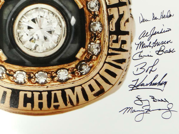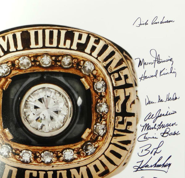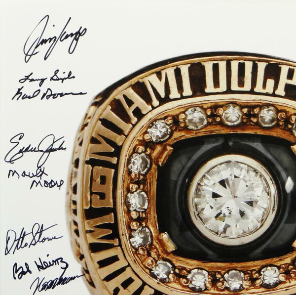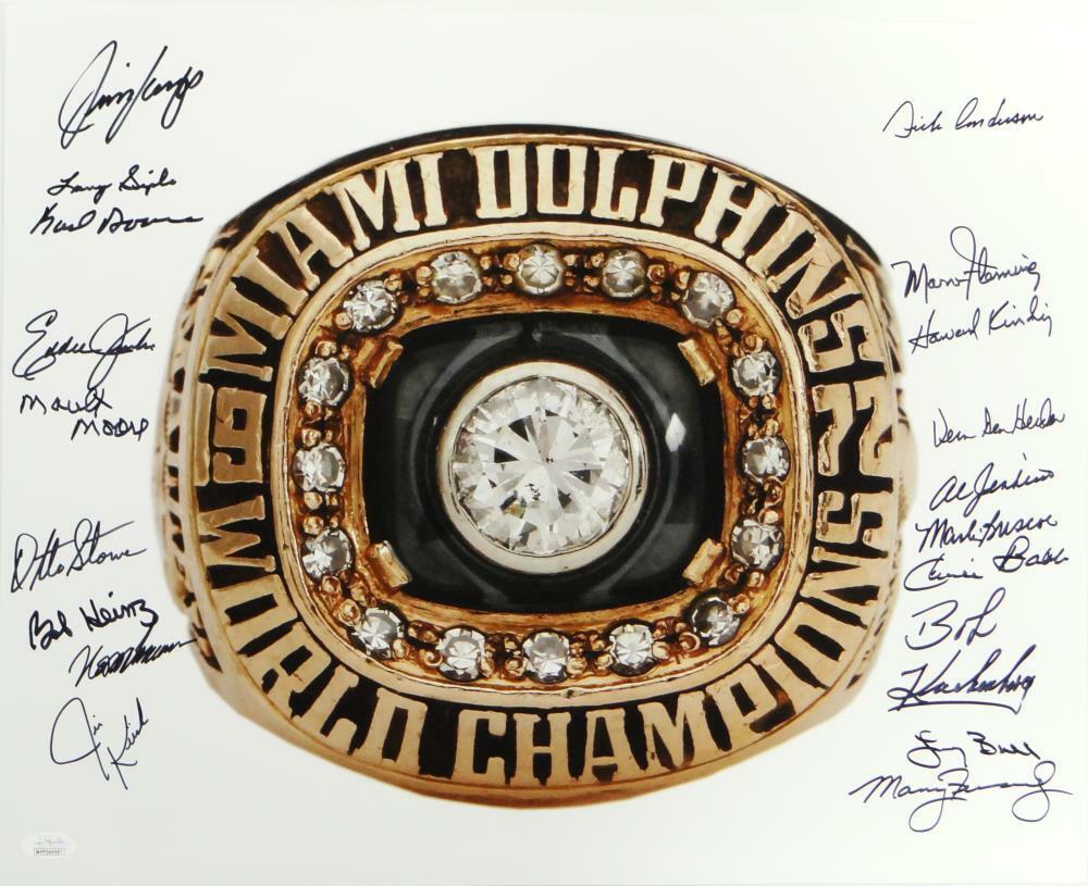 72 Dolphins Autographed 16x20 Super Bowl Ring w/ 19 Sigs -JSA W Auth *Black This is a Hand Autographed 16x20 Photo of the Super Bowl VII Ring and signed by 19 players of the Perfect Season. Players include: Howard Kindig, Charlie Babb, Karl Noonan, Marlin Briscoe, Howard Twilley, Otto Stowe, Larry Seiple, Maulty Moore, Larry Little, Jim Langer, Bob Kuechenberg, Ed Jenkins, Al Jenkins, Vern Den Herder, Bob Heinz, Marv Flemming, Manny Fernandez, Norm Evans, Larry Ball, Dick Anderson and Jim Kiick. This item has a James Spence Witness Authentication, which comes with a JSA numbered sticker and a JSA certificate of authenticity. You can view this item on the SpenceLOA website and it shows when and where the item was signed. It was signed either at a public autograph appearance or a private signing. This is a stock photo of the item. Although you may not receive this exact item, the item you receive is virtually identical and brand new in great shape.