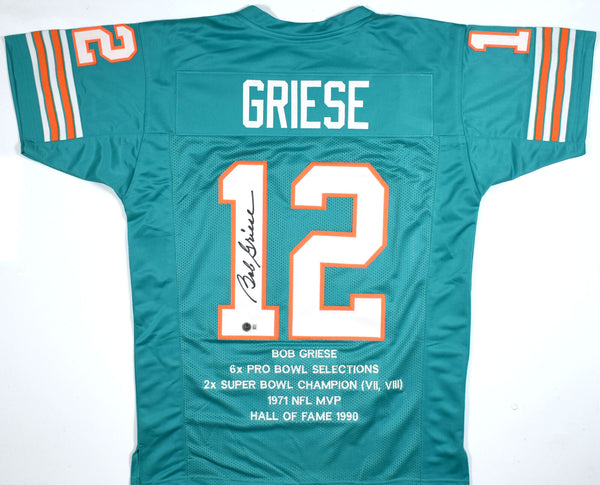THIS IS NOT AN NFL JERSEY. THIS HAS NO TAGS, NO LOGOS, NO EMBLEMS. This is a hand autograph of Bob Griese of the Miami Dolphins on a Custom Made (non name brand) Authentic Style Stat Jersey with stitched letters and numbers. This item has a Beckett Witnessed Authentication, which comes with a Beckett numbered sticker hologram and a QR Code for verification. You can view this item on the Beckett Authentication website. It was signed either at a public autograph appearance or a private signing. This is a stock photo of the item. Although you may not receive this exact item, the item you receive is virtually identical and brand new in great shape. Jersey size is XL. THIS IS NOT AN NFL JERSEY. THIS HAS NO TAGS, NO LOGOS, NO EMBLEMS. This is a hand autograph of Bob Griese of the Miami Dolphins on a Custom Made (non name brand) Authentic Style Stat Jersey with stitched letters and numbers. This item has a Beckett Witnessed Authentication, which comes with a Beckett numbered sticker hologram and a QR Code for verification. You can view this item on the Beckett Authentication website. It was signed either at a public autograph appearance or a private signing. This is a stock photo of the item. Although you may not receive this exact item, the item you receive is virtually identical and brand new in great shape. Jersey size is XL.
