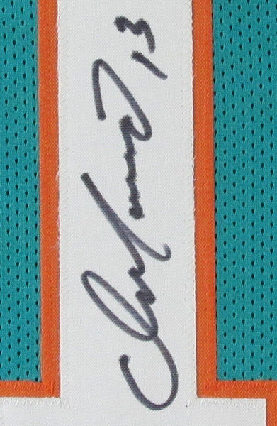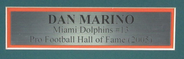 Dan marino hof autographed football jersey with photos miami dolphins framed. this item is professionally framed using a wooden shadow box "frame" measuring 1 3/4 by 3/4 . outside dimensions are approximately 41x33. wire attached to easily place on your wall. item will be secure this jersey is authenticated by jsa and includes their tamper-proof sticker and certificate of authenticity.