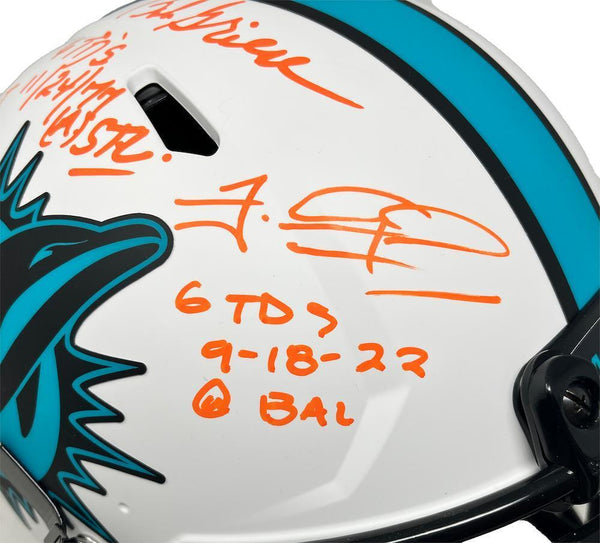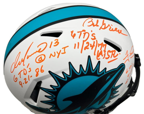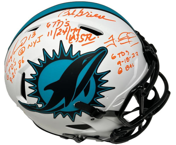 This authentic lunar eclipse speed helmet has been personally hand-signed by tua tagovailoa, dan marino and bob griese. this helmet commemorates each player throwing for 6 touchdowns in a single game. each player has inscribed this limited edition helmet with the date and team they scored 6 touchdowns on. this helmet is limited to just 22 and you are bidding on number "13" from that edition. it is officially licensed by the national football league and comes with an individually numbered, tamper-evident hologram from fanatics authentic. to ensure authenticity, the hologram can be reviewed online. this process helps to ensure that the product purchased is authentic and eliminates any possibility of duplication or fraud.