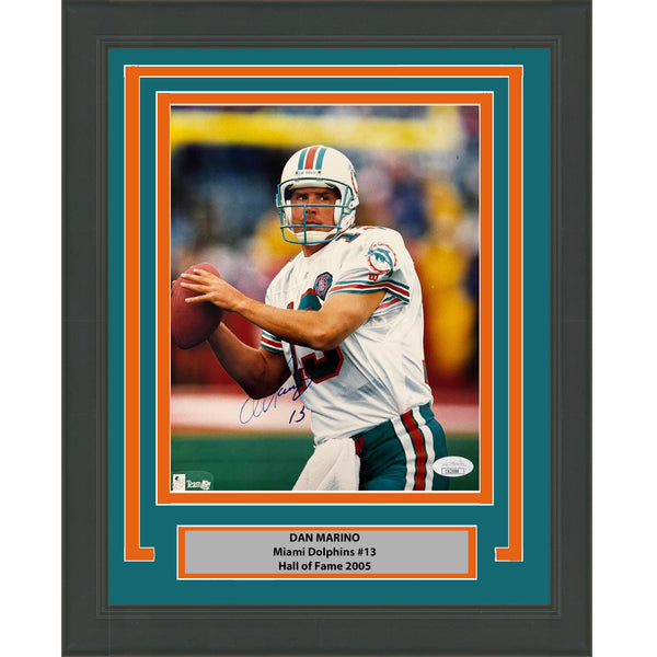 Framed Autographed/Signed Dan Marino Miami Dolphins 8x10 Football Photo JSA COA The item is professionally framed & matted and is ready to be hung in your man cave! Nameplate and matting requests can be made.
