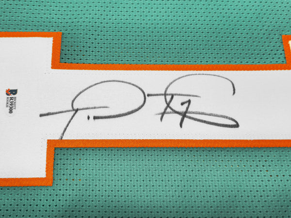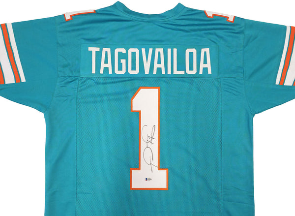 This is a Teal Jersey that has been hand signed by Tua Tagovailoa. This is a custom jersey with no name brand. The approximate size is XL. It has nice sewn in name and numbers. This item has been certified authentic by Beckett Authentication (BAS) and comes with their tamper-proof QR Code sticker that can be verified on beckett-authentication.com.