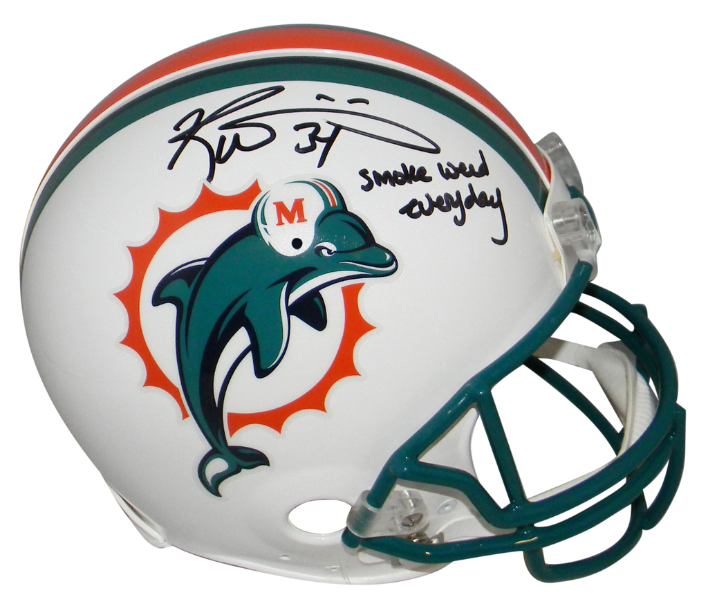 Ricky Williams, former Pro Bowl running back for the Miami Dolphins, has hand signed this Dolphins Riddell full-size authentic helmet at a private signing. He included the inscription "Smoke Weed Everyday". This helmet is fully padded inside like the ones worn on the field. This item comes with a certificate of authenticity (COA) from Beckett Authentication Services and was signed in the presence of one of their representatives. You will receive a serial-numbered COA along with a matching serial-numbered sticker on the helmet. The authenticity can be verified online by entering the serial number.Item pictured may not be the exact item you will receive. It will be similar quality, and we guarantee your satisfaction.
