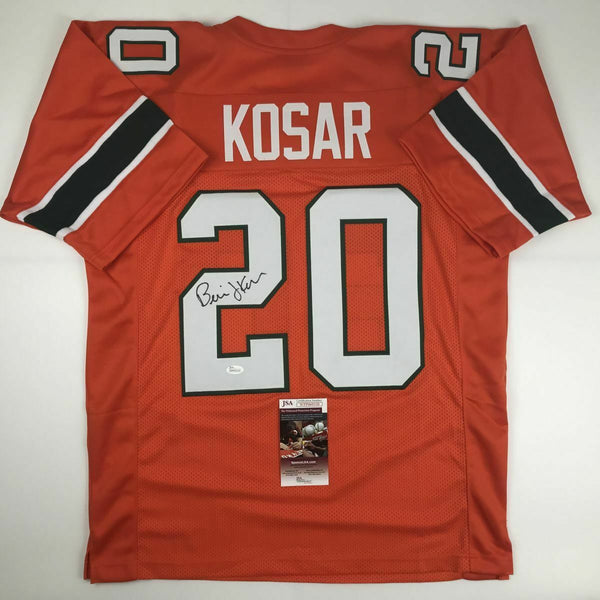Autographed/Signed BERNIE KOSAR Miami Hurricanes Orange College Jersey JSA COA This is a custom jersey and was not manufactured by or in any manner associated with any professional sports league or manufacturer. This custom jersey carries no professional sports league designation. The item is intended to be an autographed collectible. Reference of team in the title is to allow the purchaser a point of association. The custom jersey displays the name, number and authenticated signature of the player. This item in no way is affiliated with or connected to any professional sports organization. The autograph, as always is guaranteed to be authentic and has been certified as authentic by a third-party, trusted authenticator. Size is XL unless otherwise noted.