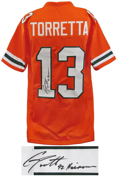 Gino Torretta signed orange custom college football jersey with '92 Heisman' inscription. Item comes with a Schwartz Sports Memorabilia tamper-proof numbered hologram and Certificate of Authenticity which can be verified online. Jersey is size XL.