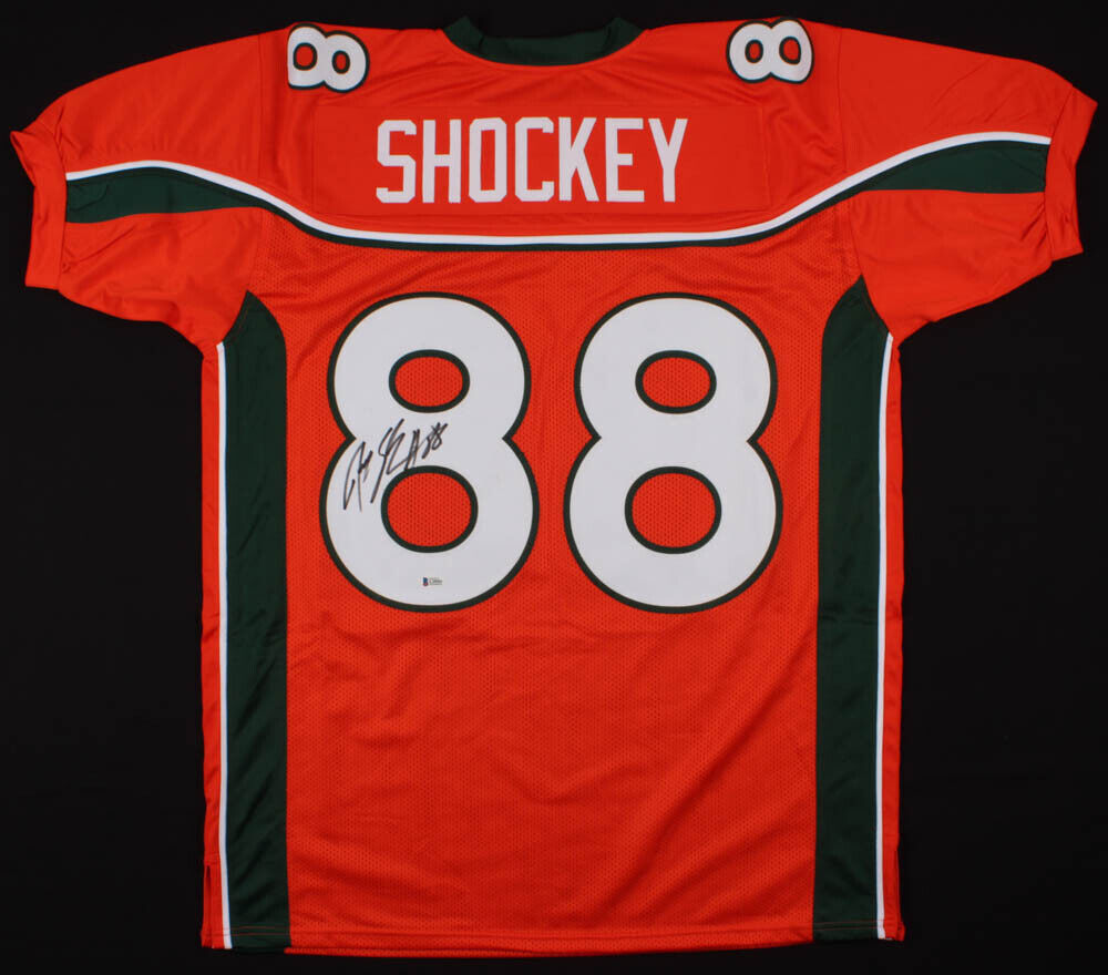 Custom on-field style jersey. Everything sewn on, size XL. Hand-signed in black felt-tip pen by Jeremy Shockey. The lot / autograph(s) includes an official Beckett Authentication Services serially numbered hologram and matching COA for authenticity purposes. The signing of this item was witnessed by Beckett.Authentication: Beckett COA