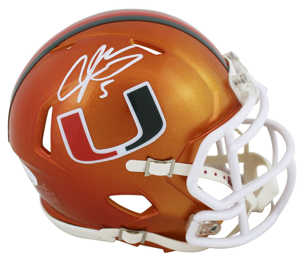 This Autographed Alternate Flash Speed Mini Helmet has been Personally Signed by Andre Johnson of the Miami Hurricanes. This item is 100% Authentic to include a Certificate of Authenticity (COA) / hologram by JSA Witness. This is a JSA Witnessed Protection Program item which means a JSA representative was present when this item was being signed. We conducted an autograph signing with Andre Johnson where multiples of the same item were signed. While the photographs are representative of this item, the size, placement and strength of the signature may vary. Each item is hand signed, therefore, each autograph is unique. This item can be verified through JSA Witness.