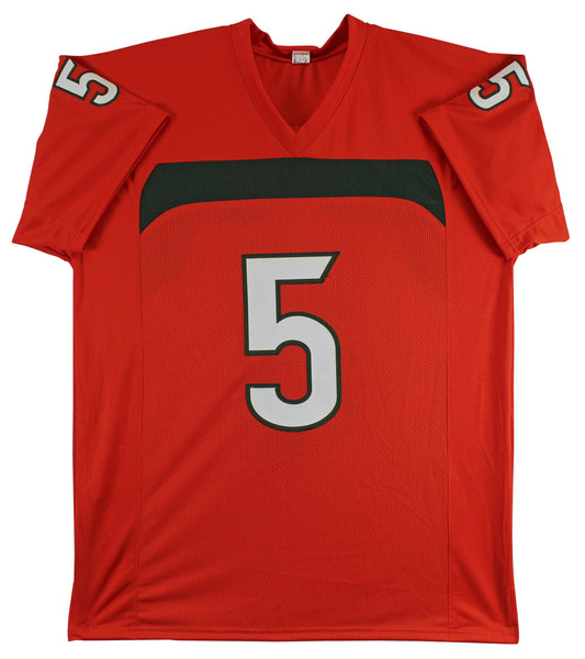 This Autographed Orange Pro Style Jersey has been Personally Signed by Andre Johnson of the Miami Hurricanes. This item is 100% Authentic to include a Certificate of Authenticity (COA) / hologram by JSA Witness. This is a JSA Witnessed Protection Program item which means a JSA representative was present when this item was being signed. We conducted an autograph signing with Andre Johnson where multiples of the same item were signed. While the photographs are representative of this item, the size, placement and strength of the signature may vary. Each item is hand signed, therefore, each autograph is unique. This item can be verified through JSA Witness. This is a X-Large sized, non-branded, custom-stitched Jersey.