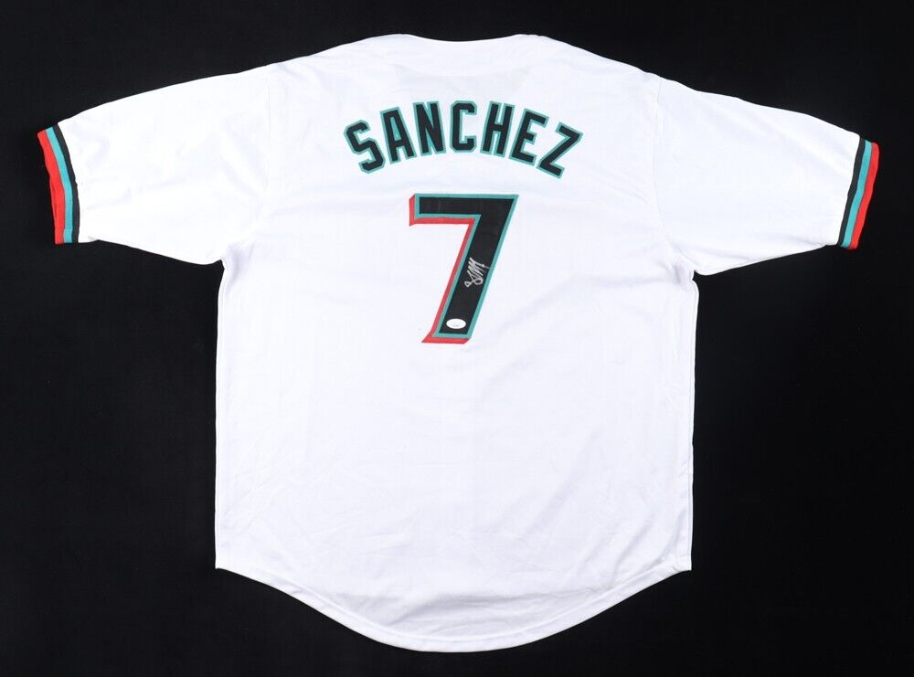 Custom on-field style jersey. Everything sewn on, size XL. Hand-signed and inscribed by Jesus Sanchez.The autograph(s) includes an official James Spence Authentication (JSA) hologram and matching COA for authenticity purposes. Authentication: JSA COA Custom on-field style jerseys are a more affordable option for autograph seekers. These jerseys do not have any brand name or tags and are made in the Philippines. They feature stitched on names and numbers and are made to look very similar to the on-field jerseys that the players wear. These custom jerseys are very commonly used in the memorabilia industry.
