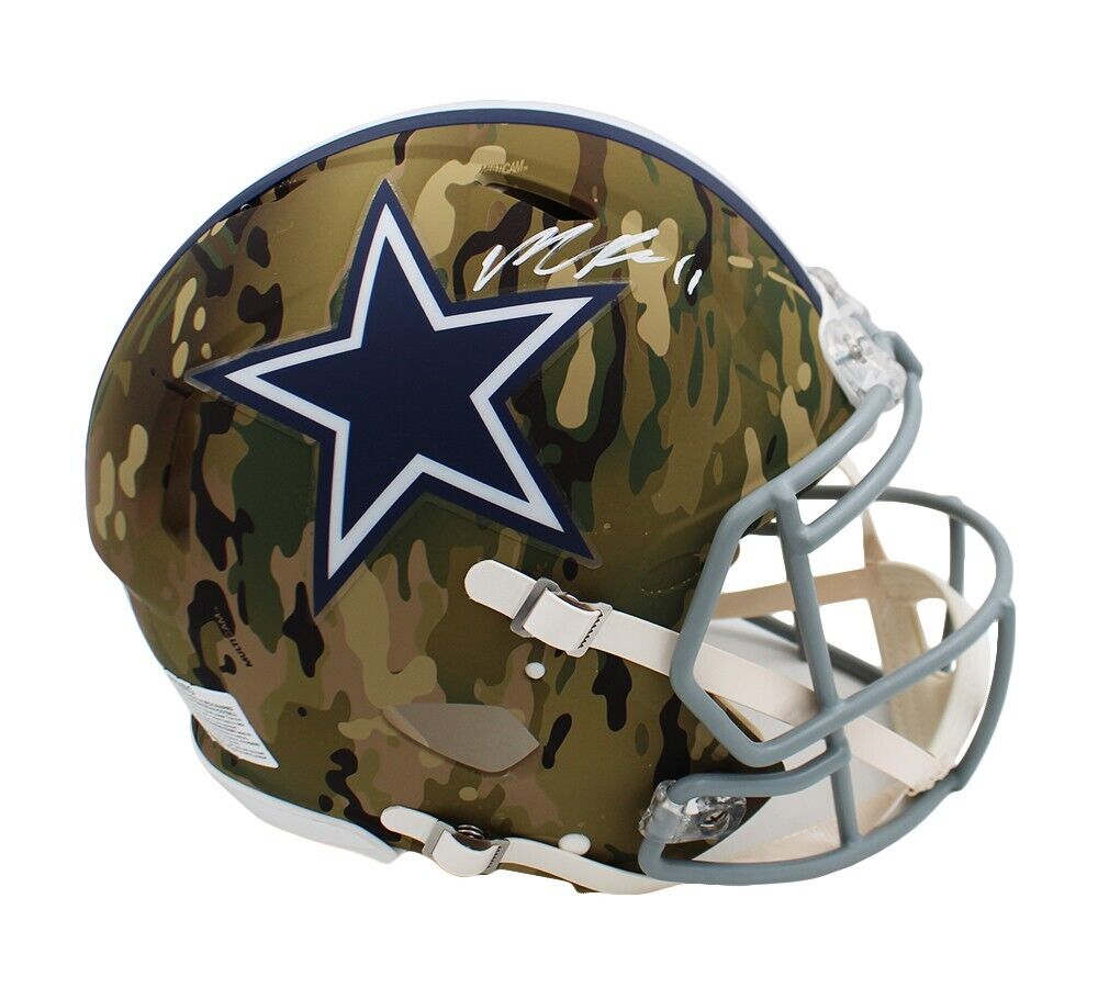 A Dallas Cowboys Speed Authentic Camo NFL Helmet hand signed by Micah Parsons. The item and signature are in excellent condition. Micah was drafted into the NFL in 2021 by the Dallas Cowboys. He was Butkus-Fitzgerald Linebacker of the Year, a First-team All-Big Ten, and he was a Cotton Bowl Defensive MVP in 2019. AUTHENTICATION: The item is accompanied by a Fanatics Authentic Serial Numbered and Databased Hologram
