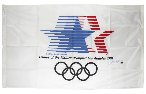 This Autographed 1984 Olympic Games Flag has been Personally Signed by Michael Jordan of the Chicago Bulls. This item is 100% Authentic and comes with a PSA/DNA Certification Card and a matching numbered Hologram. The authenticity can be verified on Professional Sports Authenticator website.