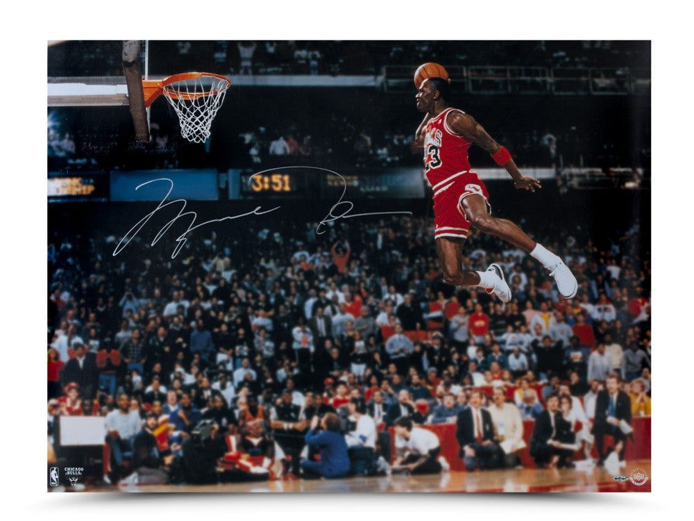 Michael Jordan is considered one of the greatest basketball showmen of all time. Not only did he earn 6 NBA titles during his tenure with the Chicago Bulls, but he also locked up 10 individual scoring titles. But an event that helped put Michael's indelible mark on the sport occurred in 1988 when he captivated the hometown crowd in Chicago during the NBA's Annual Gatorade Slam-Dunk Contest. Michael earned top honors to score his second consecutive Slam-Dunk crown. Relive MJ's well-documented acrobatics by purchasing this 30" x 40" autographed picture of him in mid-flight during the final round of the competition. Jordans silver signature has been deemed authentic by virtue of Upper Deck Authenticated's Five-Step Authentication Process.