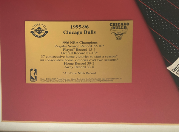 You are bidding on one of the most hard to come by Michael Jordan autographed jerseys. Is the original Champion Michael Jordan autographed pinstripe jersey. Adding to this amazing piece is that Jordan inscribed this "72-10" to commemorate the Chicago Bulls history making season, going 72-10. This jersey has been sold out for over three decades and is nearly impossible to find. This pro-cut jersey is custom framed and ready to hang on the wall. This framed jersey measures 34" x 42." Limited to only 72, this jersey is numbered "42" of 72. It includes the Upper Deck Authenticated tamper proof hologram and original Certificate of Authenticity. MONEY BACK GUARANTEE! If for any reason you are not completely satisfied with the quality or authenticity of your purchase, we will gladly give you a full refund or exchange, whichever you prefer up to 30 days after purchase. Please feel free to e-mail us with any questions. Thank you. Authenticator Pre-Certified Authenticator: Upper Deck Authenticated History of item: Michael Jordan signed this item in the presence of a representative from Upper Deck Authenticated. Describe how you came to possess this item: Super Sports Center is a fully authorized dealer for Upper Deck Authenticated as well as Mounted Memories and Steiner Sports. Other information about you and / or the item: Super Sports Center strives to deliver the most authentic in sports memorabilia from trusted companies like Mounted Memories, Steiner Sports and Upper Deck Authenticated. If it exists, we can find it for you!