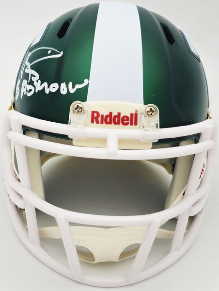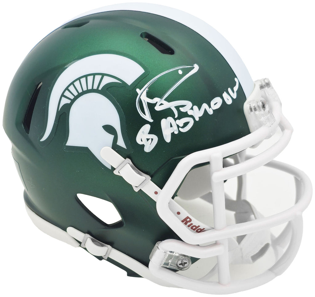 This is a Michigan State Spartans Satin Green Speed Mini Helmet that has been hand signed by Andre Rison. This item was inscribed "Bad Moon." This item has been certified authentic by JSA and comes with their tamper-proof sticker BUT IS MISSING the matching certificate of authenticity.