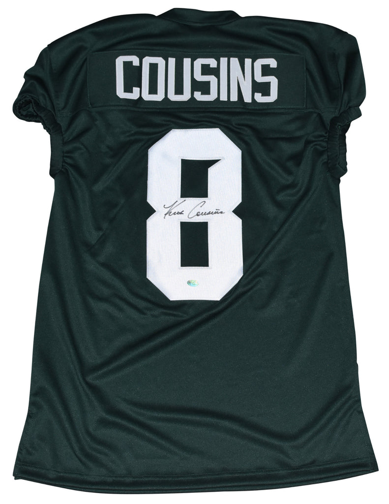 Kirk Cousins, former star quarterback for the Michigan State Spartans, has hand signed this green custom game cut jersey at a private signing. Jersey is size XL and all letters/numbers are sewn-on. This item comes with a certificate of authenticity (COA) from GT Sports Marketing, one of the leaders in the industry. You will receive a paper COA along with an official GTSM hologram on the jersey.Item pictured may not be the exact item you will receive. It will be similar quality, and we guarantee your satisfaction.