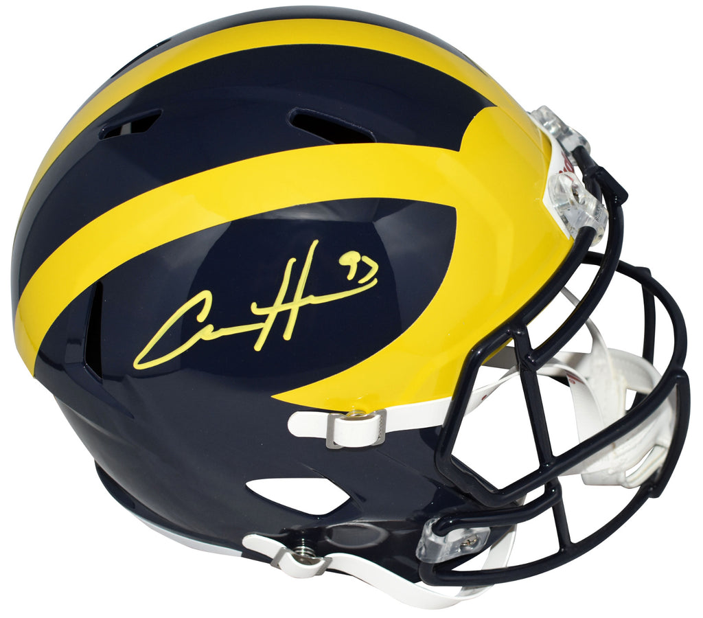 Aidan Hutchinson, former All-American defensive end for the Wolverines, has hand signed this Michigan Riddell Speed full-size replica helmet at a private signing. This item is authenticated by Beckett Authentication Services and was signed in the presence of one of their representatives. Their tamper-evident hologram featuring a QR code and serial number is on the item. The authenticity can be verified online by entering the serial number or scanning the QR code.Item pictured may not be the exact item you will receive. It will be similar quality, and we guarantee your satisfaction.