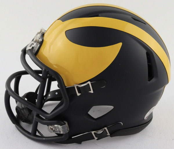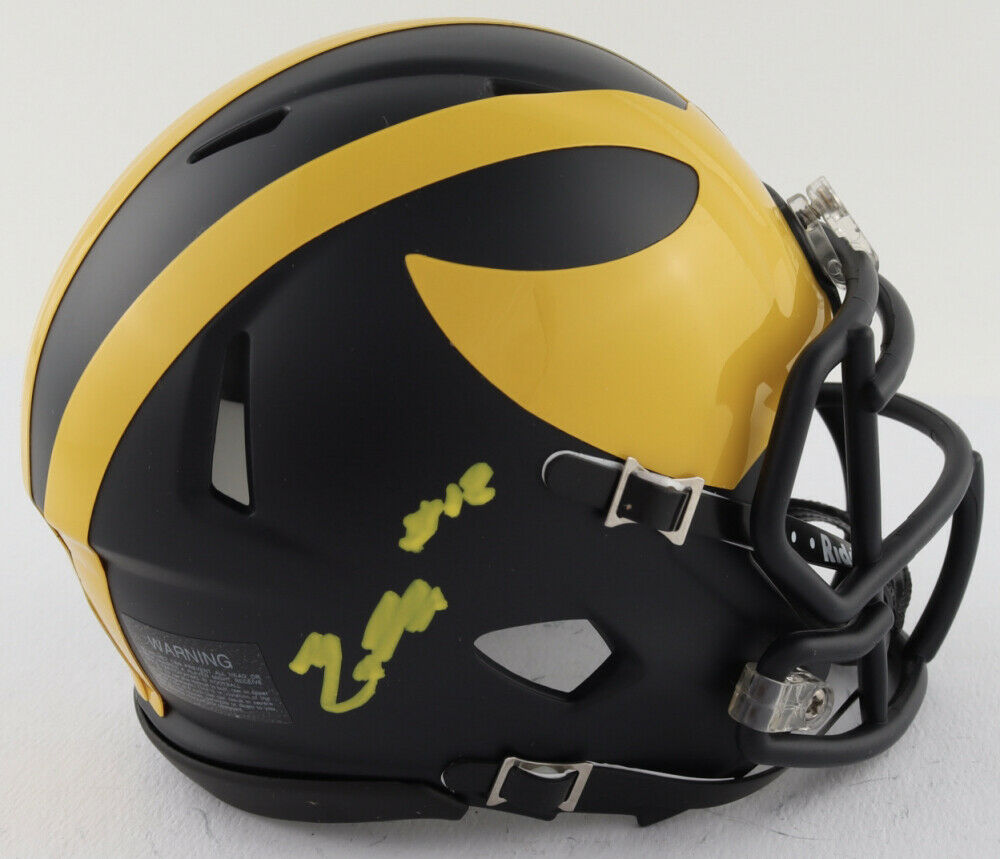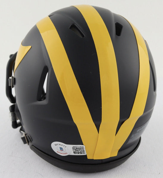 Riddell Michigan Wolverines Speed mini helmet. Hand-signed by Cade McNamara.The lot / autograph(s) includes an official Beckett Authentication Services serially-numbered hologram and QR Code card for authenticity purposes. The signing of this item was witnessed by Beckett.Authentication: Beckett Hologram with Scannable QR Code card Shop our ebay store / Friendly Confines Collectibles for thousands of different autographed jerseys
