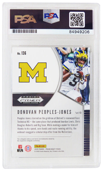 Donovan Peoples-Jones signed Michigan Wolverines 2020 Panini Prizm Draft Picks rookie football card #136. The card has been authenticated and encapsulated by PSA/DNA and the number can be verified online. The image of the item is a stock photo, as we may have multiples of the item in stock. The Slabbed Card you will receive will be of the card described. (Same grade, Same authentication) You may or may not receive the exact PSA serial number on the slab label shown in image.