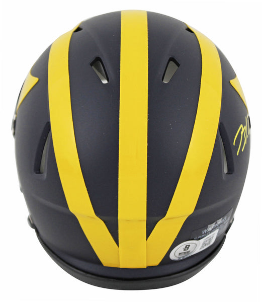 This Autographed Speed Mini Helmet has been Personally Signed by Blake Corum of the Michigan Wolverines. This item is 100% Authentic to include a hologram by Beckett Authentication Services. This item will come with an affixed Beckett Authentication Services (BAS) authentication sticker, which includes a scannable QR code to verify authenticity. Please note that Beckett no longer provides serial-numbered COA cards, and the attached BAS sticker will serve as the complete authentication for this item. This is a BAS Witnessed Protection Program item which means a Beckett Authentication Service representative was present when this item was being signed. We conducted an autograph signing with Blake Corum where multiples of the same item were signed. While the photographs are representative of this item, the size, placement and strength of the signature may vary. Each item is hand signed, therefore, each autograph is unique. This item can be verified through BAS Witnessed.