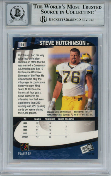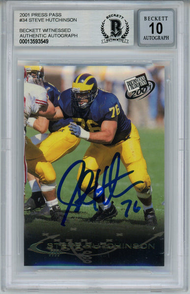 Steve Hutchinson Signed 2001 Press Pass #34 Rookie Card Beckett 10 Slab 35013 The number in the listing title is just an inventory sku for our records and is not the authentication number. The item pictured is a stock photo unless otherwise noted. This is a 2001 Press Pass #34 rookie trading card that was personally autographed by Steve Hutchinson. This has been professionally slabbed by Beckett Authentication Services (BAS) and includes a certificate of authenticity from Denver Autographs.
