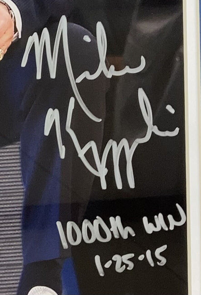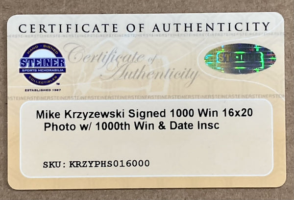 Featured is a Mike Kryzewski signed 16x20 photo, inscribed "1000th Win 1-25-15". This photo has been hand signed by Kryzewski and comes with the Steiner Sports hologram and certificate of authenticity. This photo has been professionally framed and matted and is approximately 22x27. This photo would make a great addition to any sports memorabilia collection! SPECIFICATIONS Autographed By: Mike Krzyzewski Team: Duke Sport: Basketball Authentication: Steiner Sports