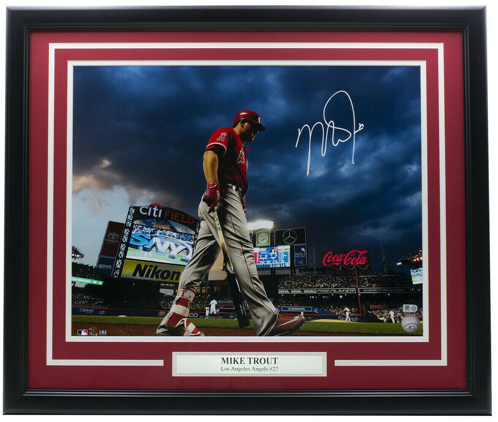 Featured is a Mike Trout signed framed Los Angeles Angels 16x20 baseball photo. This photo was hand signed by Mike Trout and authenticated by MLB authentication services. Included with the frame is a MLB hologram. This item would make a great addition to any sports memorabilia collection.. SPECIFICATIONS Autographed By: Mike Trout Team: Los Angeles Angels Sport: Baseball-MLB Authentication: MLB