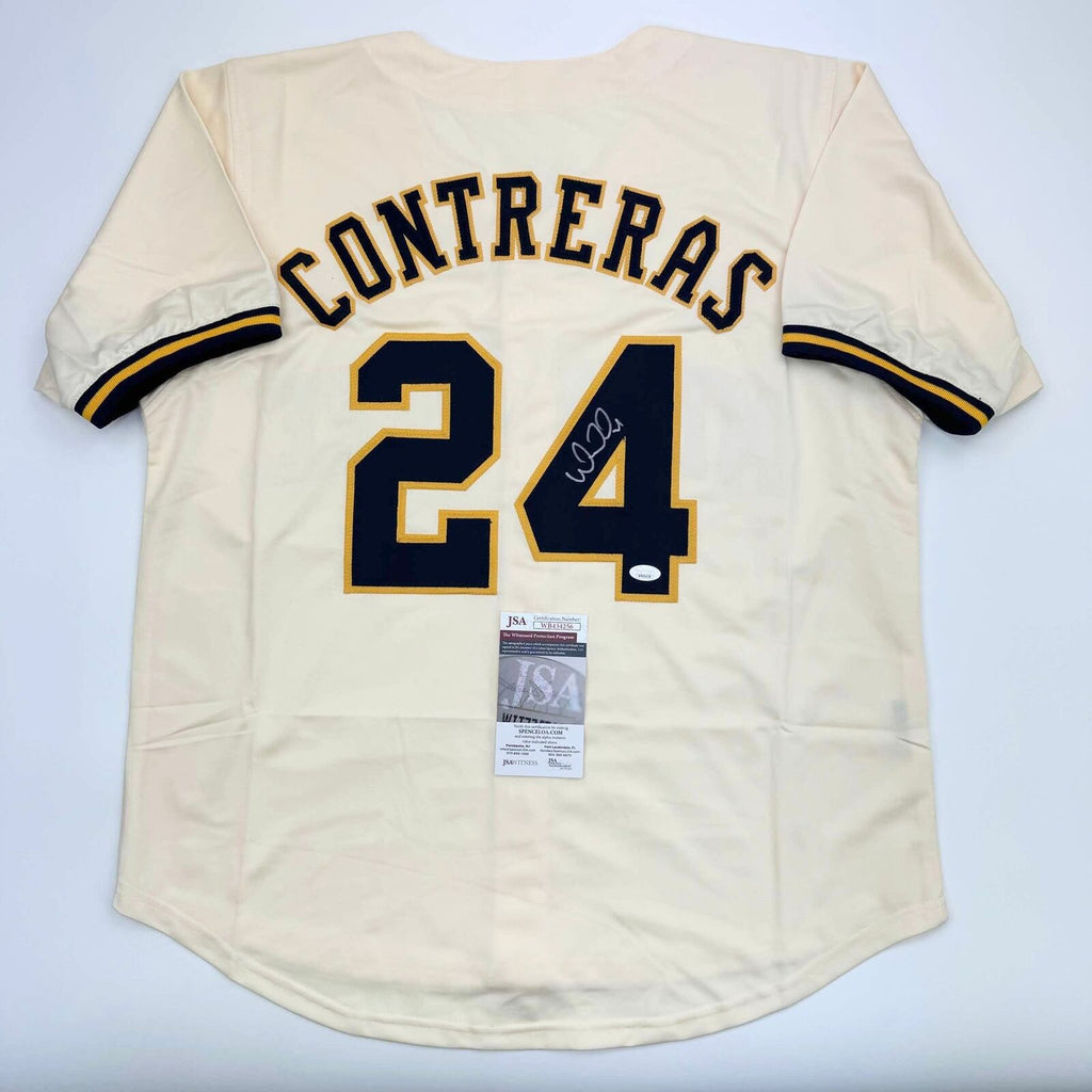 Autographed/Signed William Contreras Milwaukee Cream Baseball Jersey JSA COA Jersey has no brand names or logos. This is a custom jersey and was not manufactured by or in any manner associated with any professional sports league or manufacturer. This custom jersey carries no professional sports league designation. The item is intended to be an autographed collectible. The custom jersey displays the name and number of the player. This item in no way is affiliated with or connected to any professional sports organization. Size is XL.