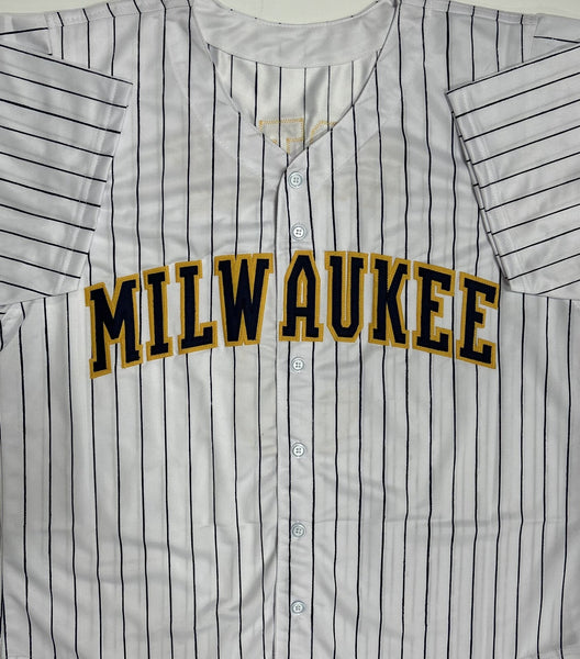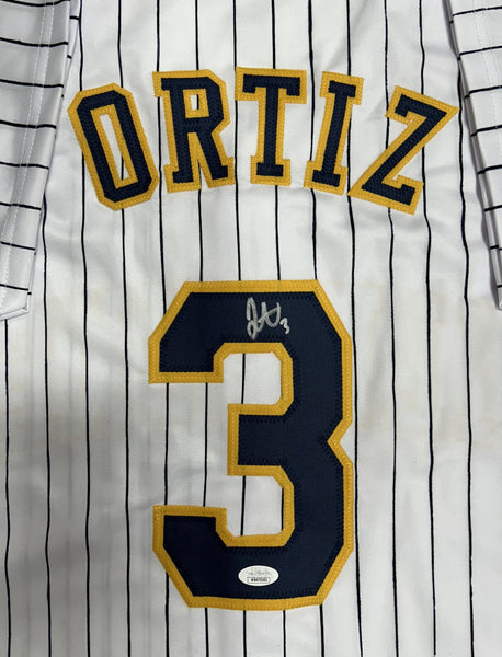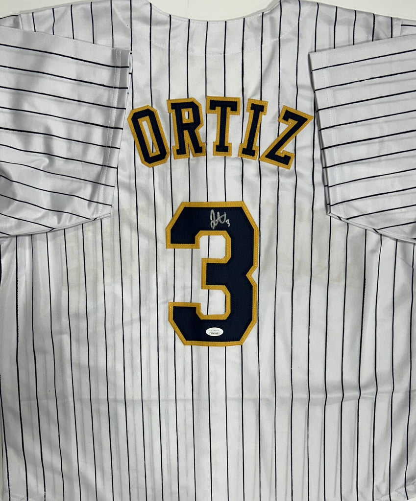 Custom replica jersey of Milwaukee Brewers Infielder JOEY ORTIZ. This jersey is signed with Silver Paint Pen and is size XL with all letters and numbers sewn in. This item was signed at a private signing in our store and would make a great addition to any Brewers collection. This autograph is guaranteed to be 100% authentic and will include a COA from JSA (James Spence Authentication).
