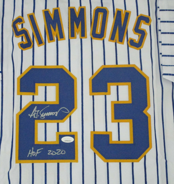 RETOR PINSTRIPE CUSTOM REPLICA JERSEY of MILWAUKEE BREWERS Hall of Famer TED SIMMONS. This jersey is signed with Silver Paint Pen with the inscription "HOF 2020". This jersey is size XL with all letters and numbers sewn in. This item was signed at a signing in our store and would make a great addition to any Brewers collection. This autograph is guaranteed to be 100% authentic and will include a COA from JSA (James Spence Authentication).