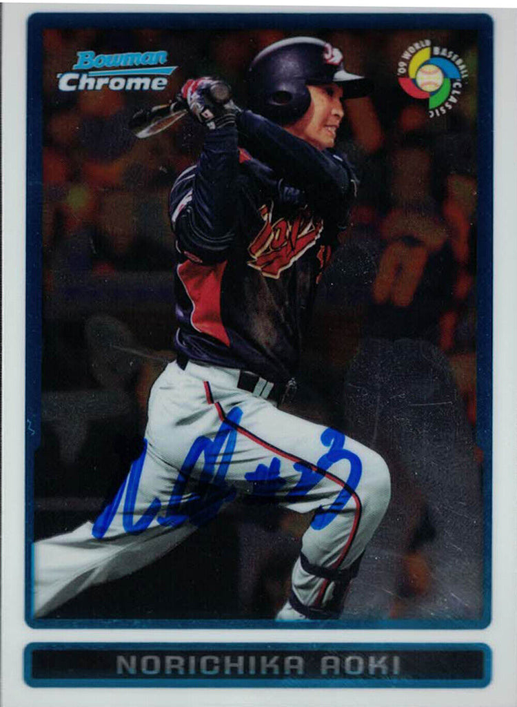Norichika Aoki Autographed Japan 2009 WBC Bowman Chrome Trading Card 24662 This is a Bowman chrome Norichika Aoki 2009 World Baseball Classic trading card #BCW21 that was personally autographed by Norichika Aoki. This is the exact card that you will receive so please see scan for condition. This includes a certificate of authenticity from Denver Autographs.