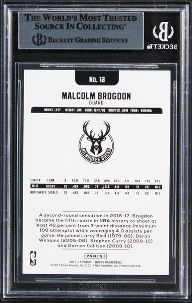 This Autographed 2017 Hoops #12 Card has been Personally Signed by Malcolm Brogdon of the Milwaukee Bucks. This item is 100% Authentic, it comes slabbed and authenticated by Beckett Authentication Services. The authenticity can be verified on Beckett Authentication Services website.