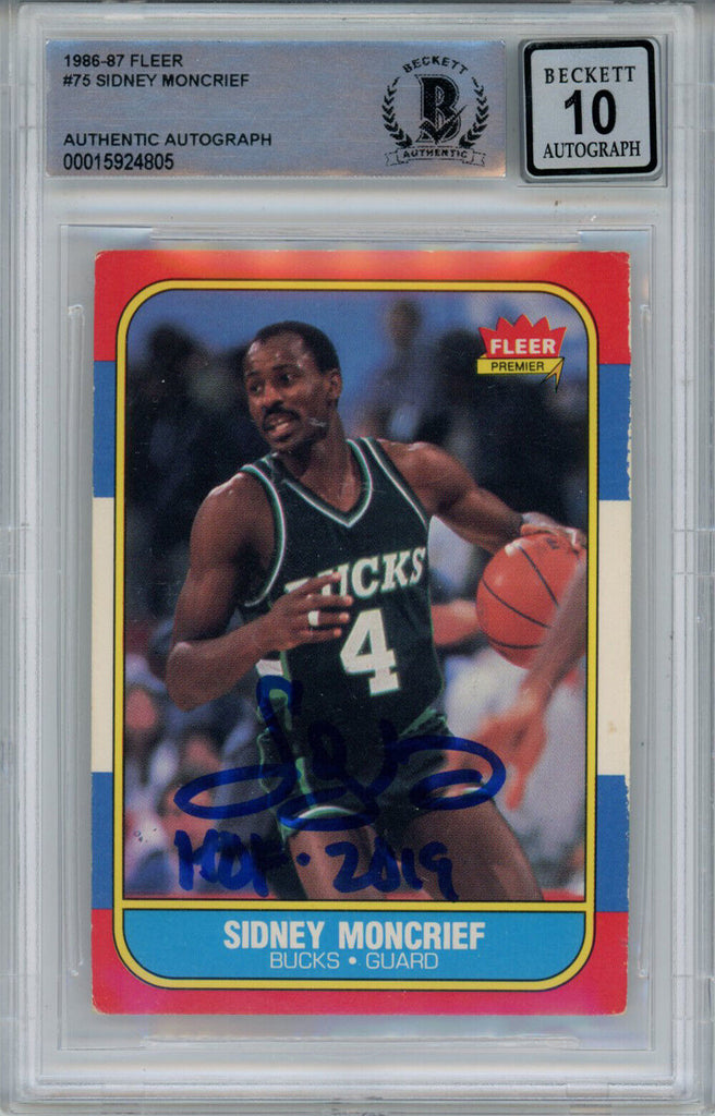Sidney Moncrief Signed 1986-87 Fleer #75 Rookie Card Beckett 10 Slab 42908 The number in the listing title is just an inventory sku for our records and is not the authentication number. This is the exact item that you will receive so please see pictures for condition. This is a trading card that was personally autographed by Sidney Moncrief. This has been professionally slabbed by Beckett Authentication Services (BAS) and includes a certificate of authenticity from Denver Autographs.