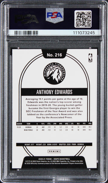 This Autographed Card Graded Mint 9! Auto Graded Gem Mint 10! 2020 Panini Hoops #216 Rookie Card has been Personally Signed by Anthony Edwards of the Minnesota Timberwolves. This item is 100% Authentic, it comes slabbed and authenticated by PSA/DNA. We have multiples of this same item. While the photographs are representative of this item, the size and placement of the signature may vary. Each item is hand signed, therefore, each autograph is unique.