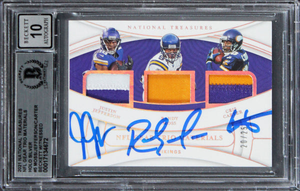 This Autographed Auto Graded Gem Mint 10! 2021 Panini National Treasures NFL Gear Trio Materials Holo Silver #5 #20/25 Card has been Personally Signed by Randy Moss, Cris Carter & Justin Jefferson of the Minnesota Vikings. This item is 100% Authentic, it comes slabbed and authenticated by Beckett Authentication Services. The authenticity can be verified on Beckett Authentication Services website.